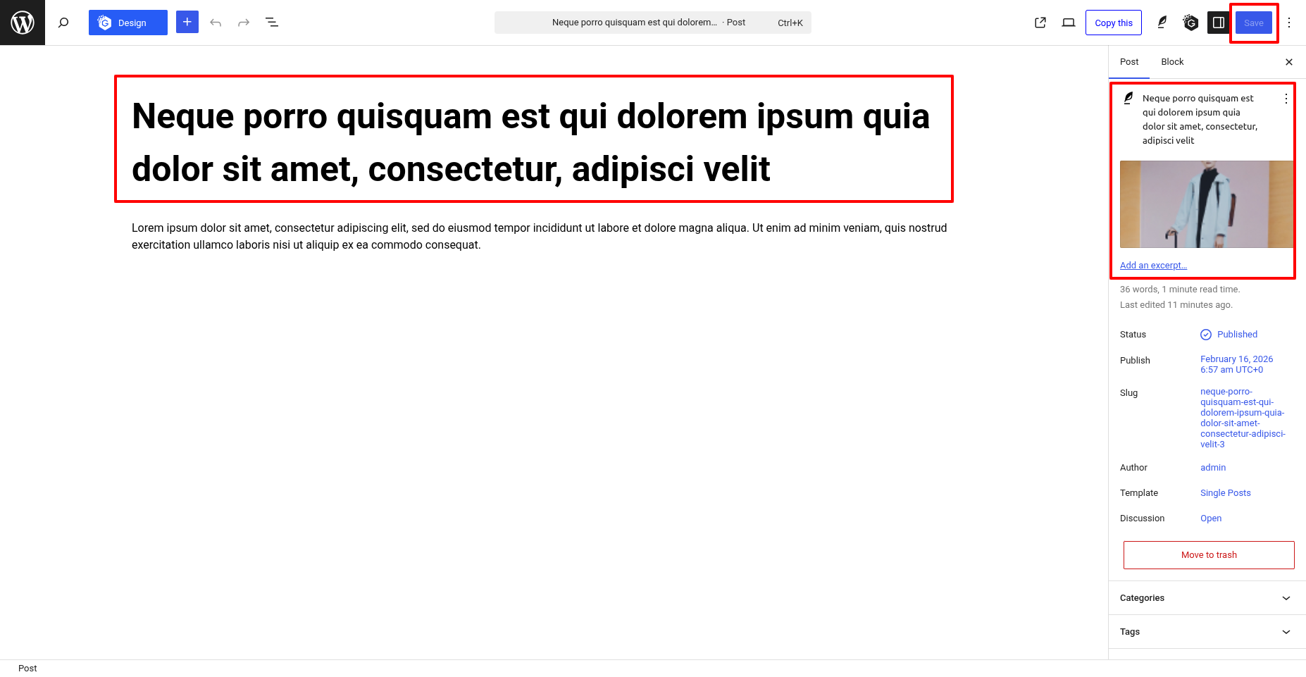 - Set a featured image along with add a title and text.