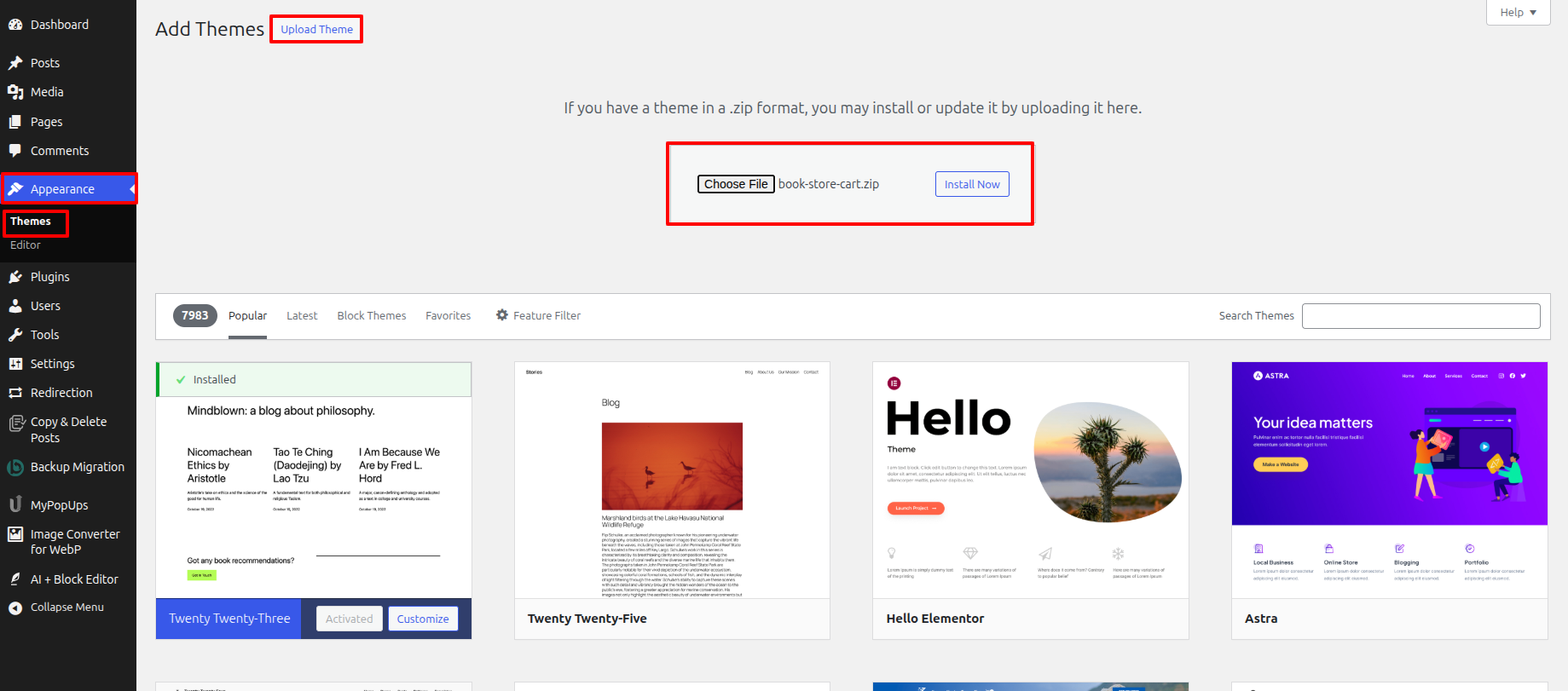 Note: You must use FTP to upload the theme to certain servers since they have restricted access to folders settings that prevent you from doing so through the admin..