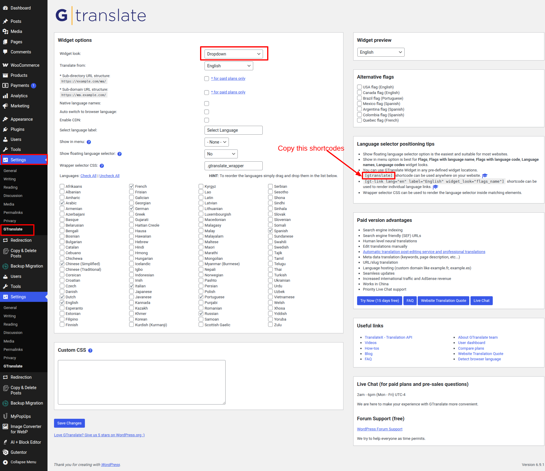- Go to Your a dashboard on the WordPress platform and Decide into Settings > GTranslate > Select the Dropdown > [gtranslate] Copy this shortcodes .