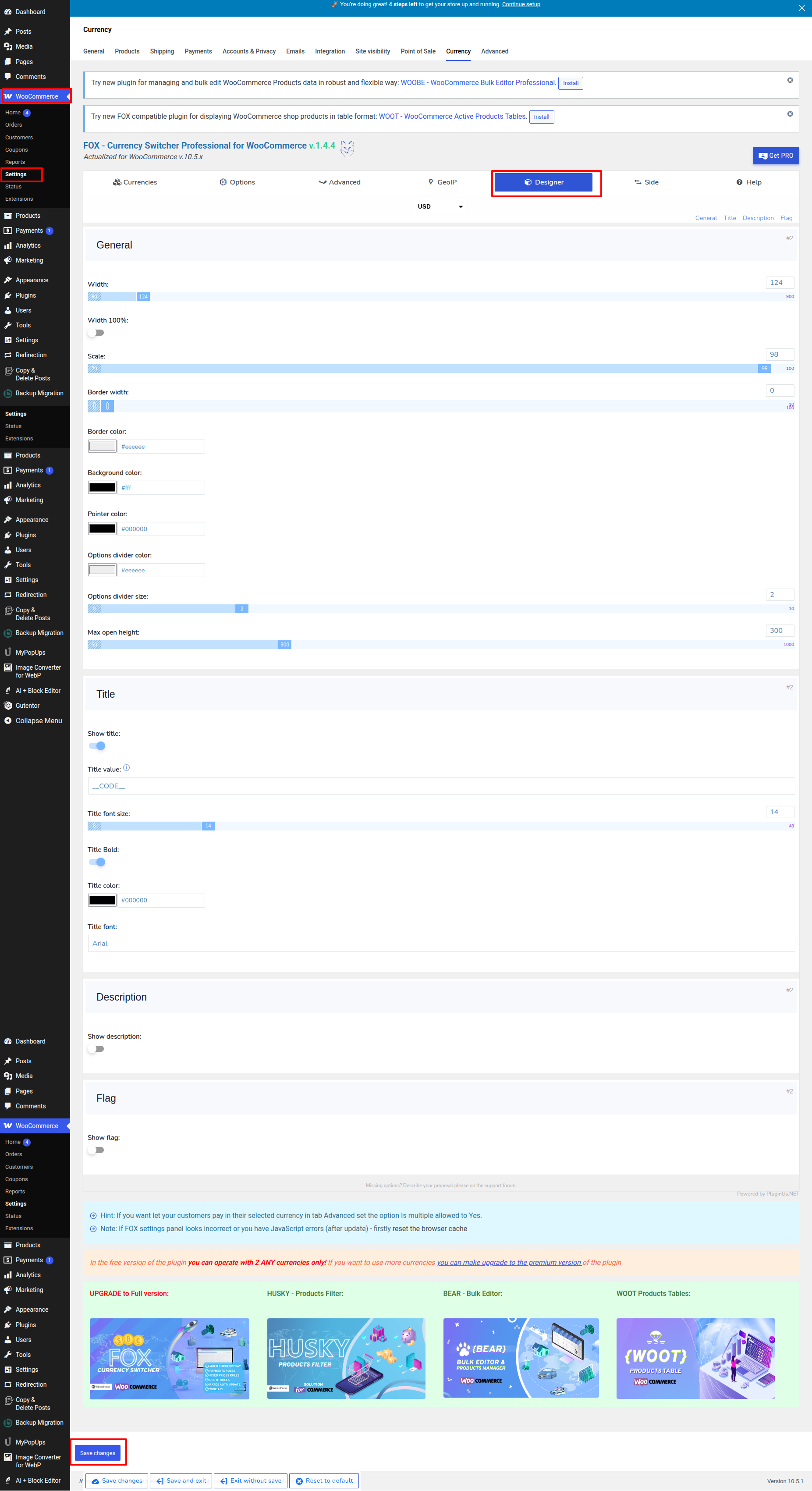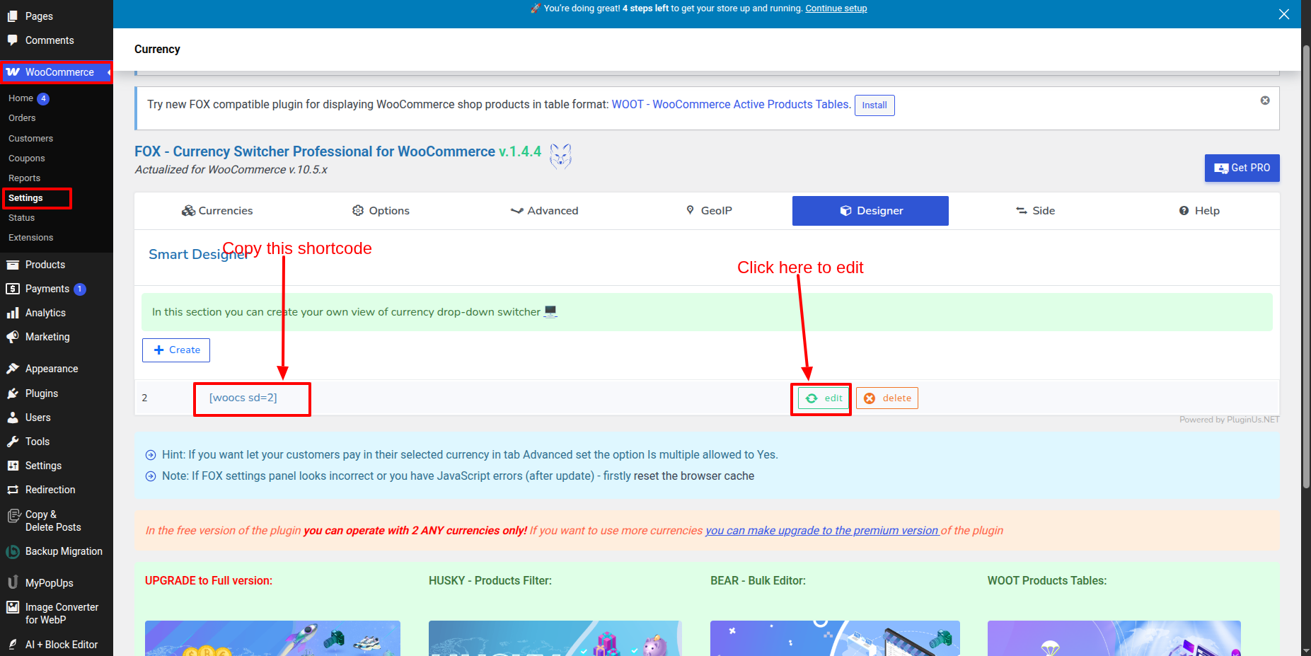 - Go to Your a dashboard on the WordPress platform and Decide into WooCommerce > Settings > Designer > + Create > [woocs sd=2]Copy this shortcodes .