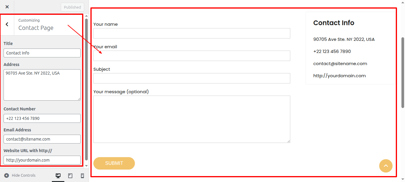 You can customize the font family and size for body text, slider text, headings, paragraphs, post/page titles, and button text.