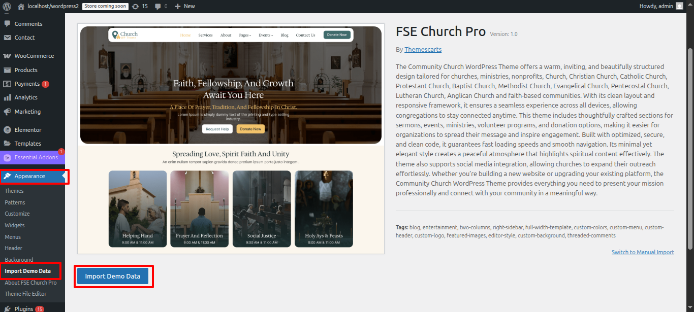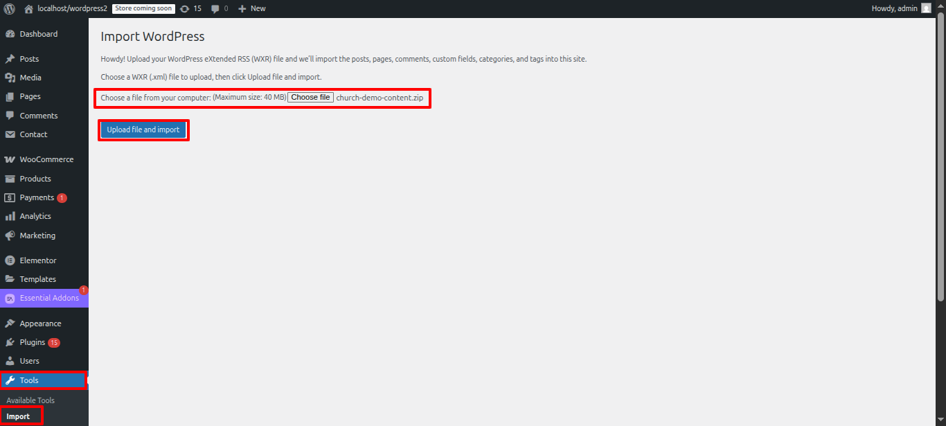 - Click the "Browse" button, select the church-demo-content.xml documents and after which select "Importing along with upload the file."