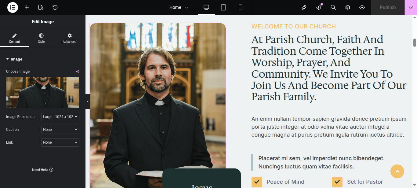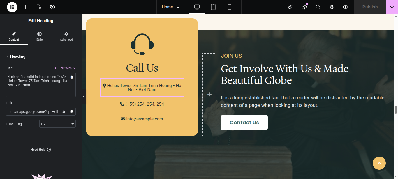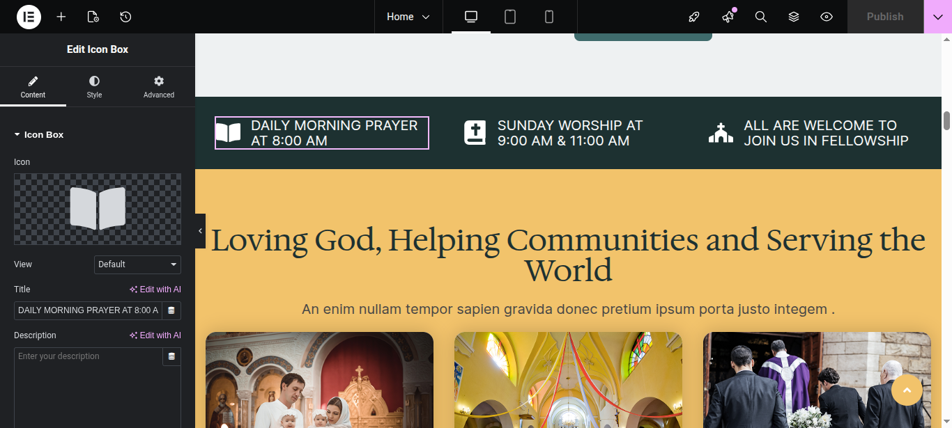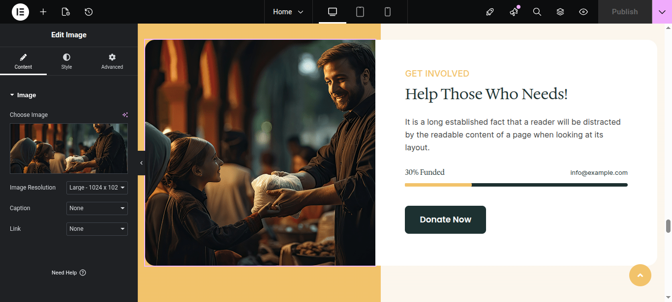 In Elementor, you can edit your page using various widgets. Simply click on the section user wish to modify, and an editor panel will appear on On the left hand side. Use this panel to customize the section as needed.