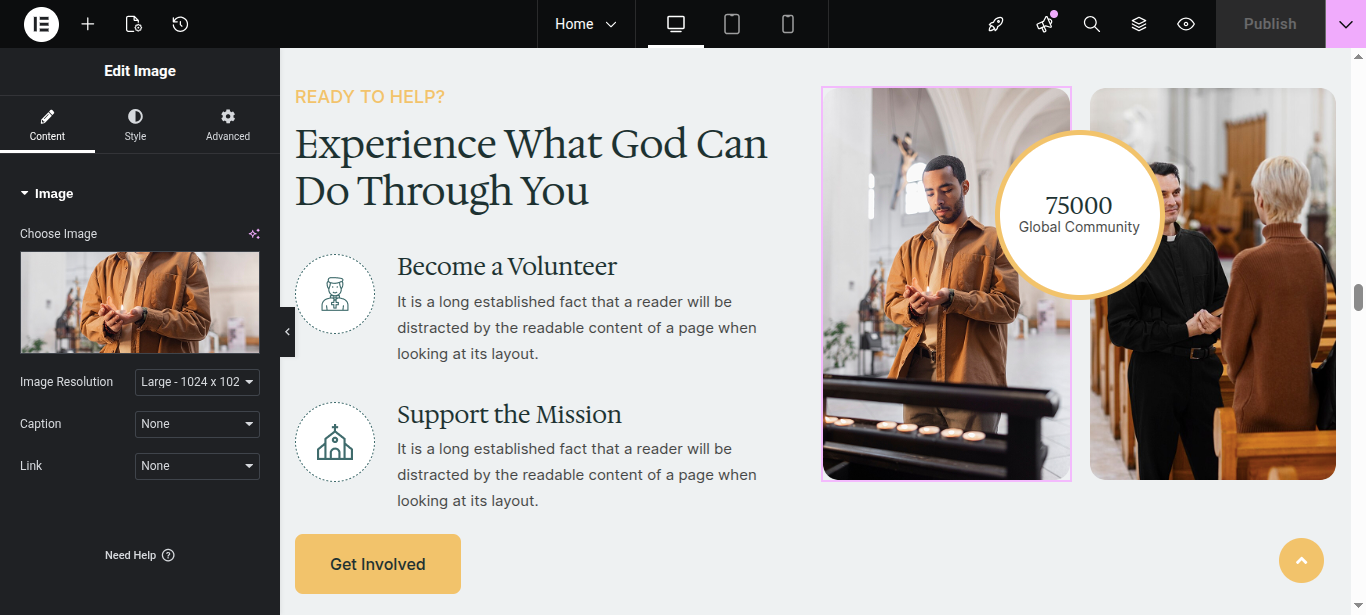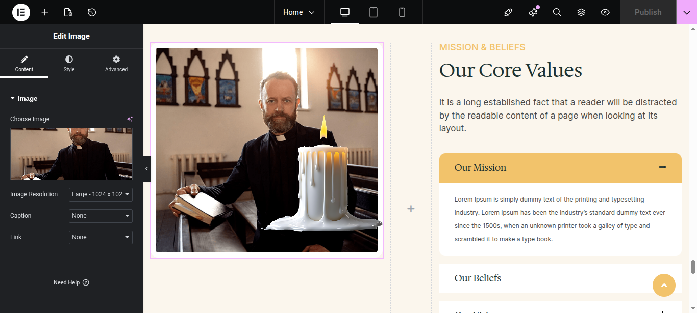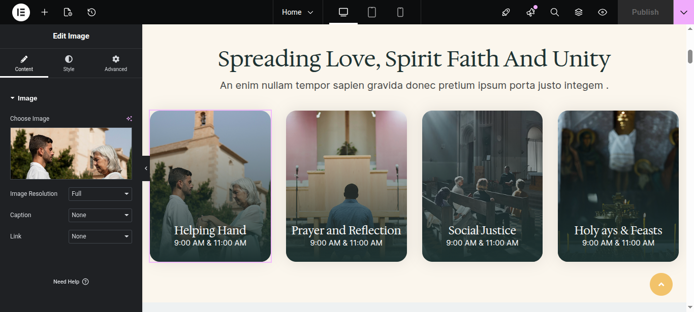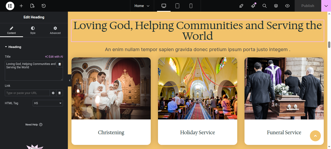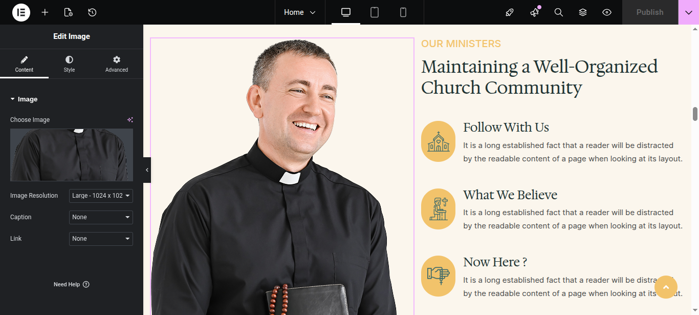 In Elementor, you can edit your page using various widgets. Simply click on the section user wish to modify, and an editor panel will appear on On the left hand side. Use this panel to customize the section as needed.