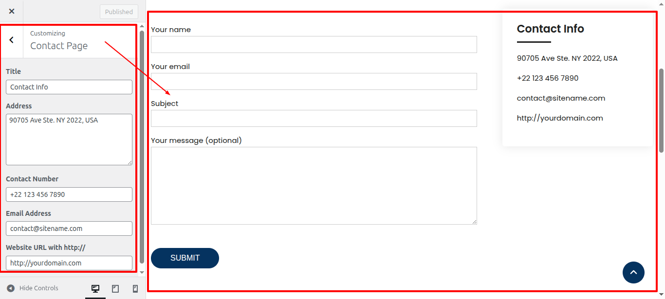 You can customize the font family and size for body text, slider text, headings, paragraphs, post/page titles, and button text.