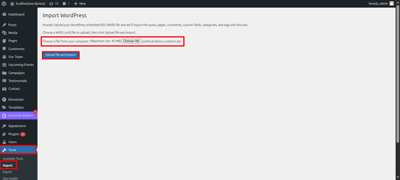 - Click the "Browse" button, select the political-demo-content.xml documents and after which select "Importing along with upload the file."