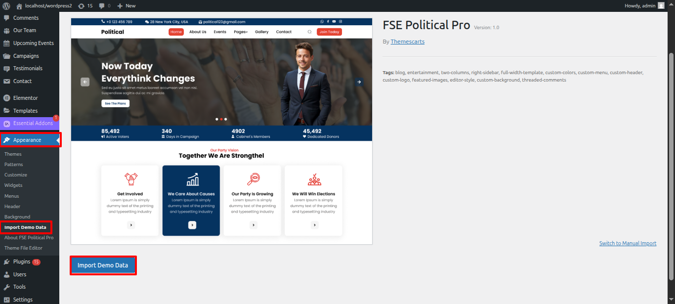 We appreciate you selecting FSE Political! The goal of this tutorial is to take you step-by-step through the complete theme for WordPress setup and customization process. It addresses a number of topics to make getting started simple. Kindly check out our Contact Area for help whether you're facing any inquiries that aren't covered in this article. Thank you for your support!