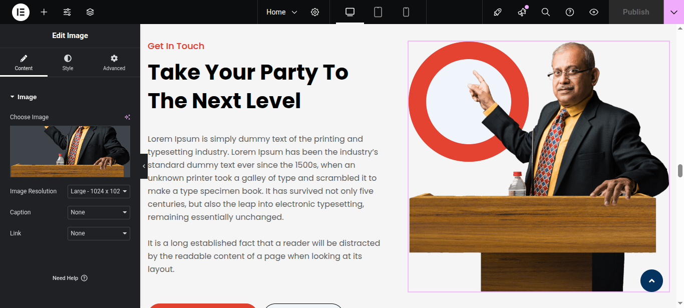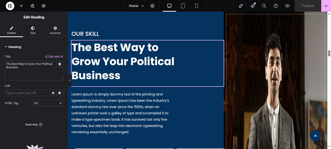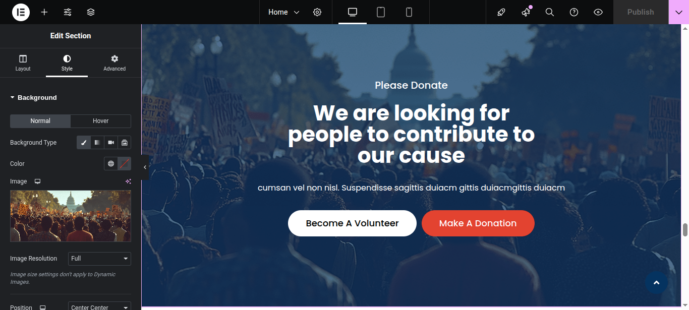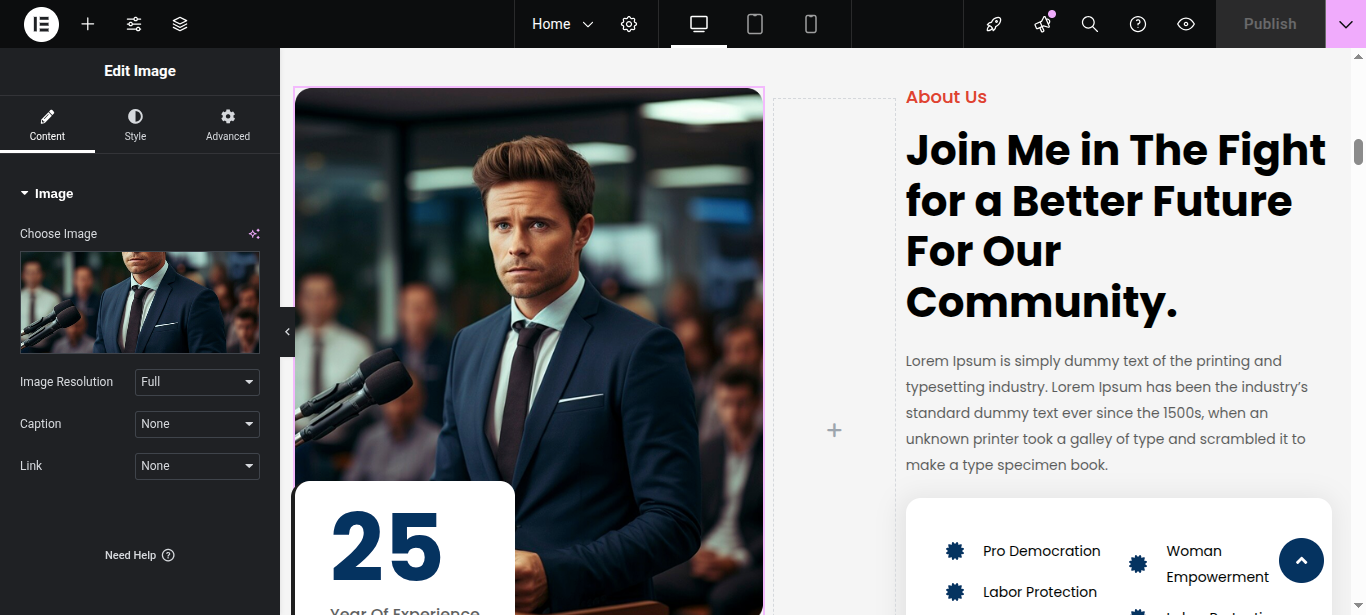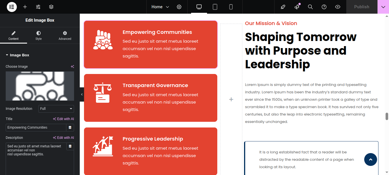 In Elementor, you can edit your page using various widgets. Simply click on the section user wish to modify, and an editor panel will appear on On the left hand side. Use this panel to customize the section as needed.