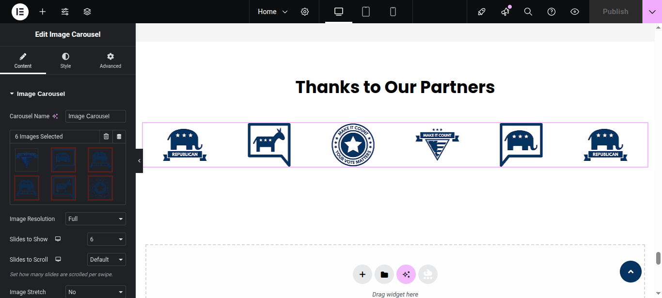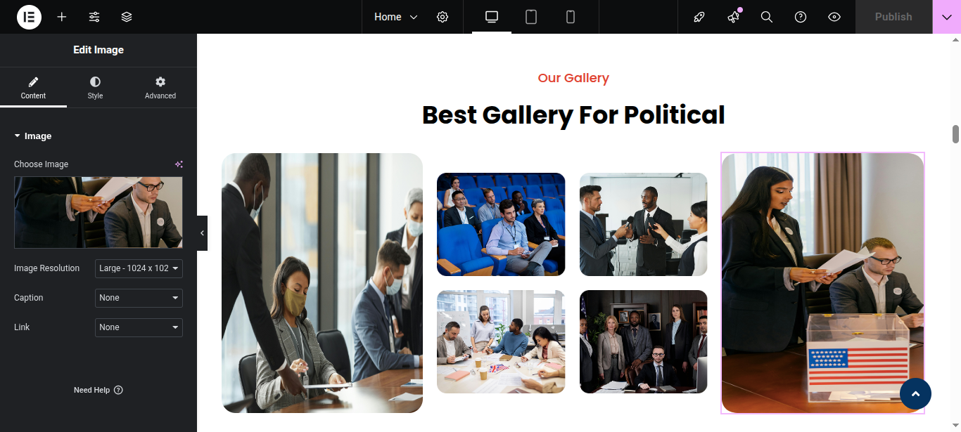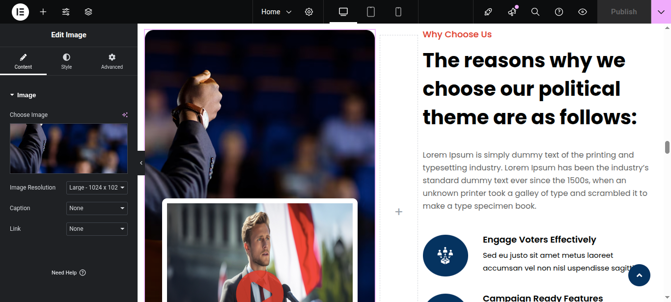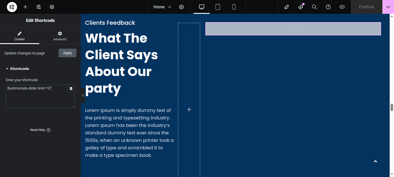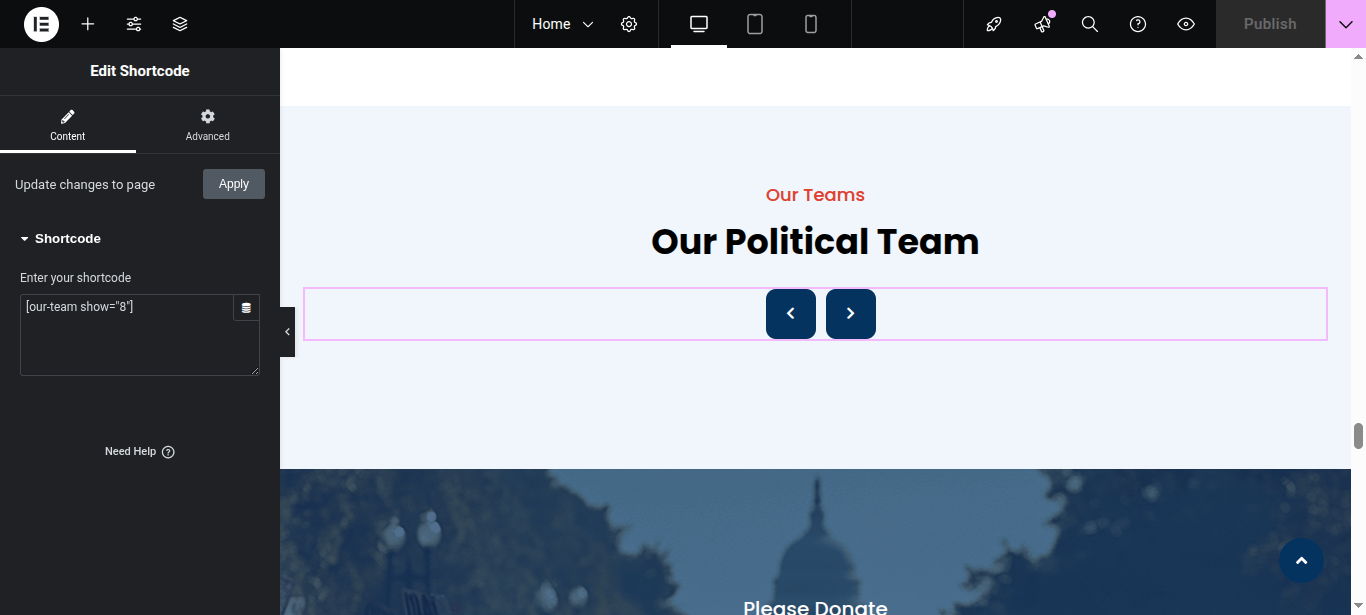 In Elementor, you can edit your page using various widgets. Simply click on the section user wish to modify, and an editor panel will appear on On the left hand side. Use this panel to customize the section as needed.