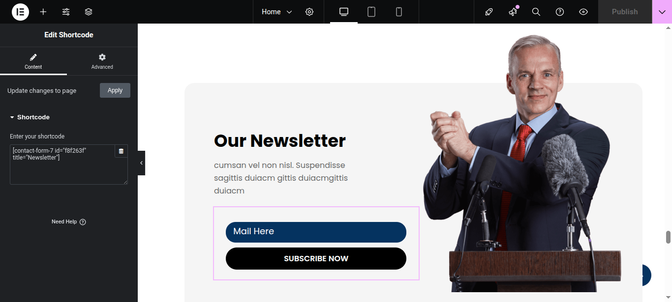- Insert the contact-form-7 plugin HTML Shortcode into the page.