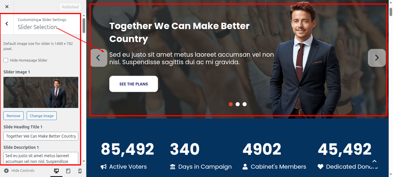 - Access the WordPress admin panel and go to Appearance > Customize > Slider Section > Slider Image Selection.