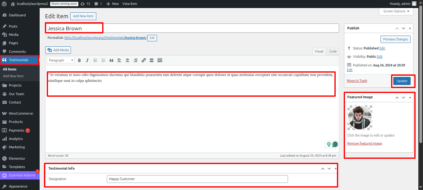 - Navigate to Testimonials > Add New in The admin panel on WordPress.