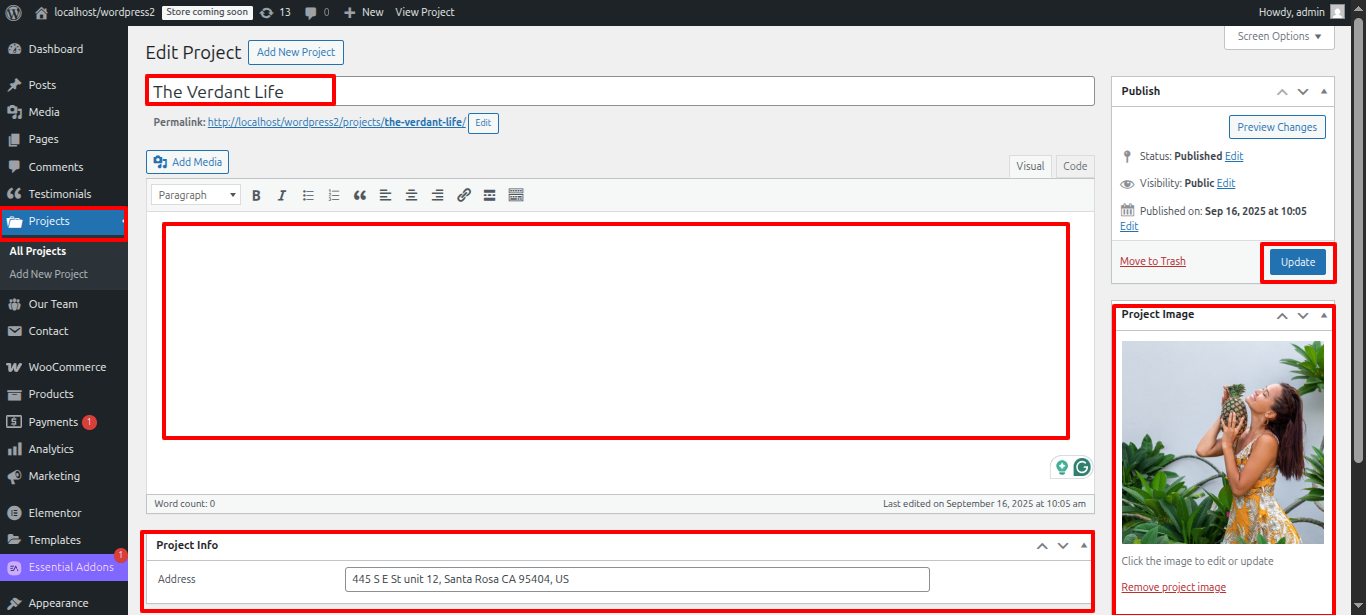 - Enter the title, description, and projects information, then set a featured image.