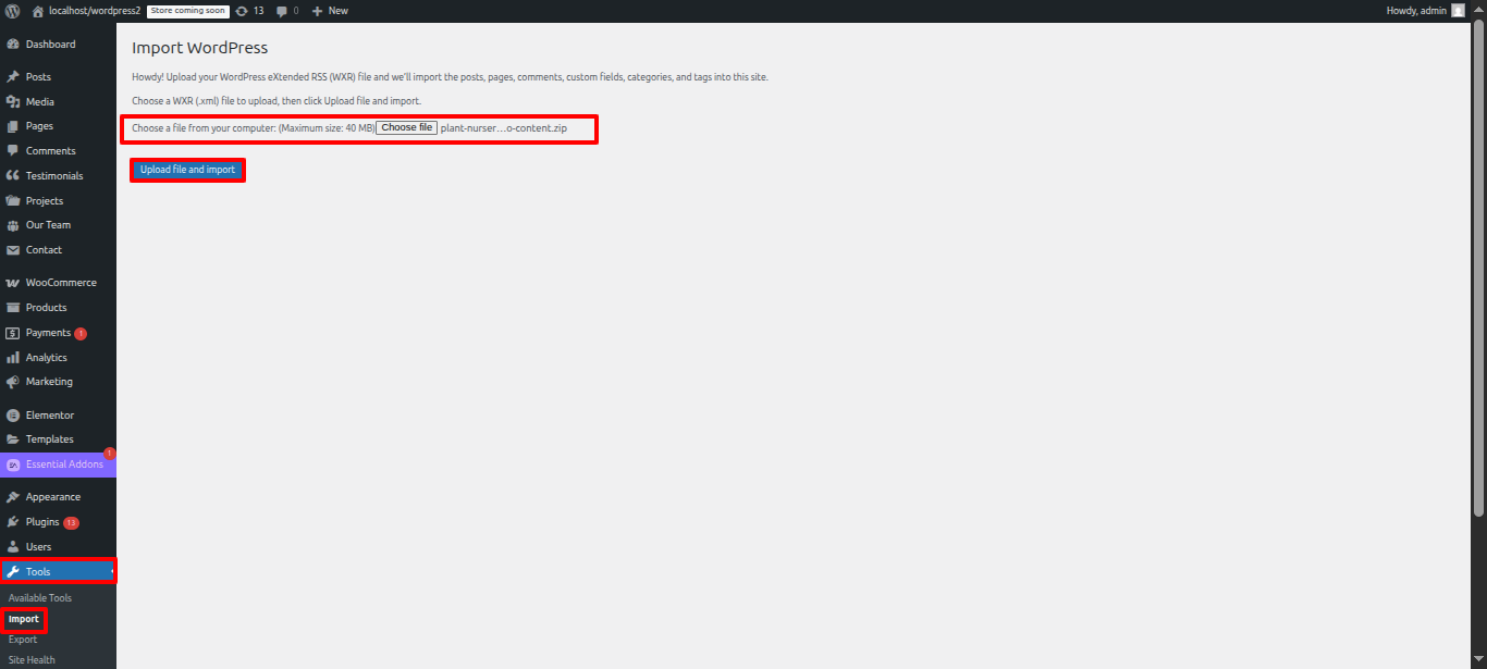 - Click the "Browse" button, select the plant-nursery-demo-content.xml documents and after which select "Importing along with upload the file."