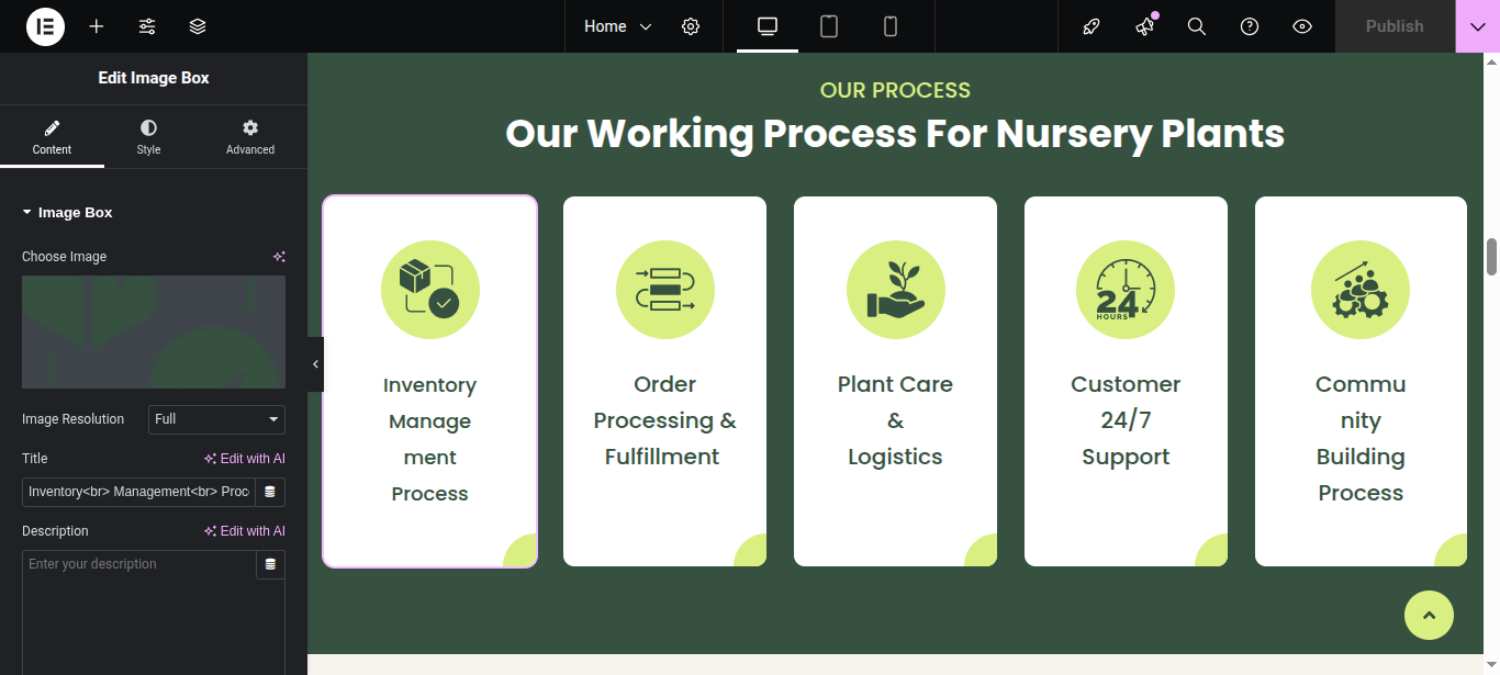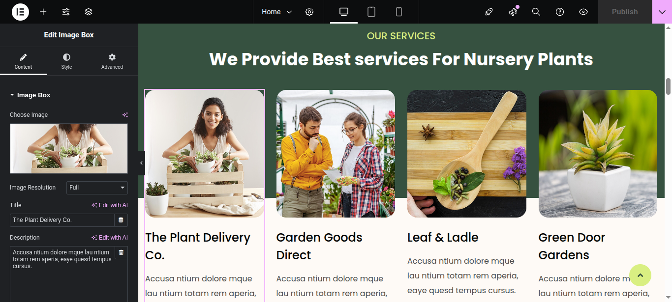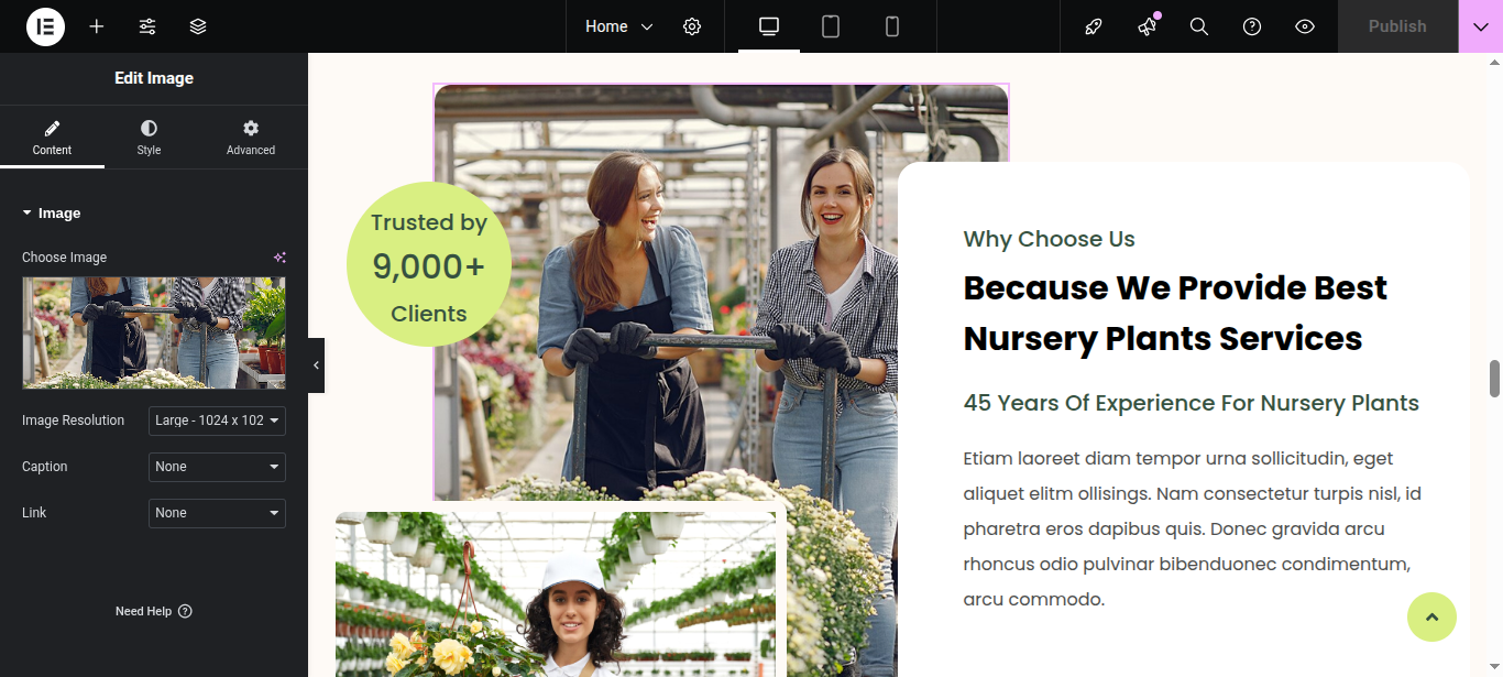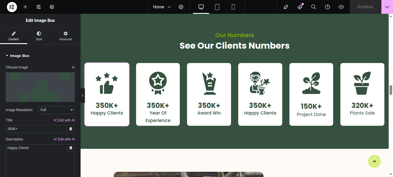 In Elementor, you can edit your page using various widgets. Simply click on the section user wish to modify, and an editor panel will appear on On the left hand side. Use this panel to customize the section as needed.