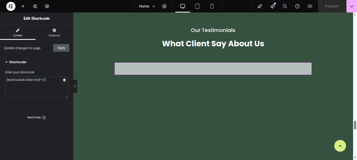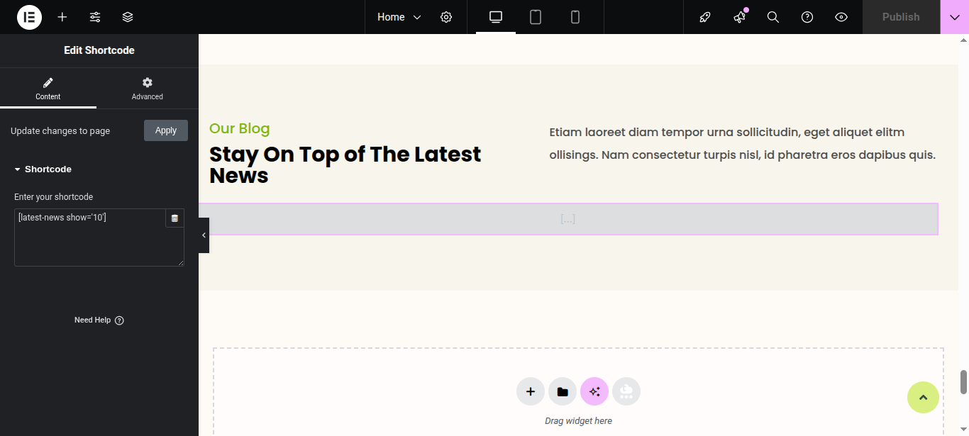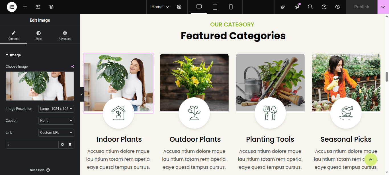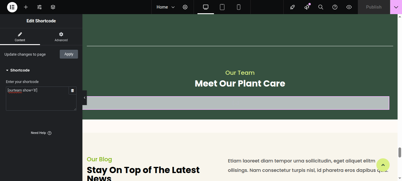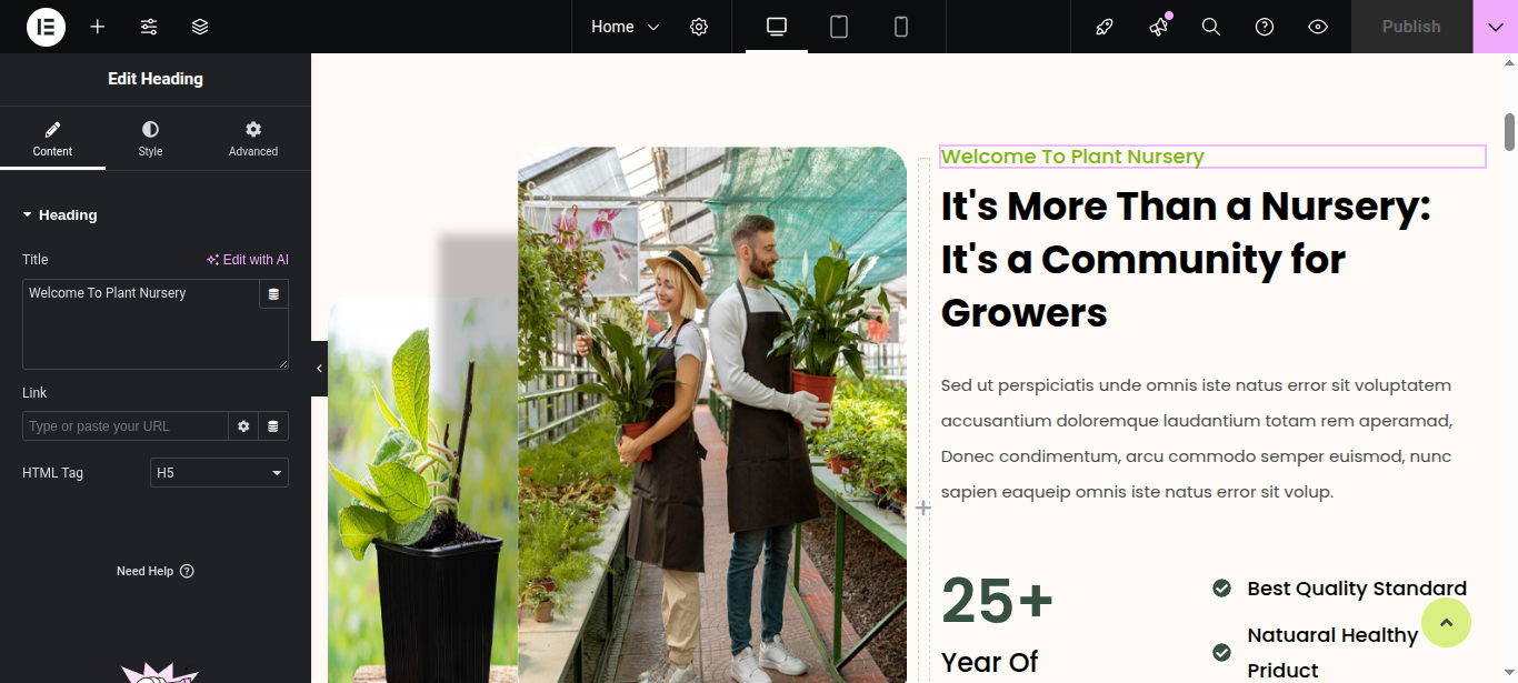 In Elementor, you can edit your page using various widgets. Simply click on the section user wish to modify, and an editor panel will appear on On the left hand side. Use this panel to customize the section as needed.