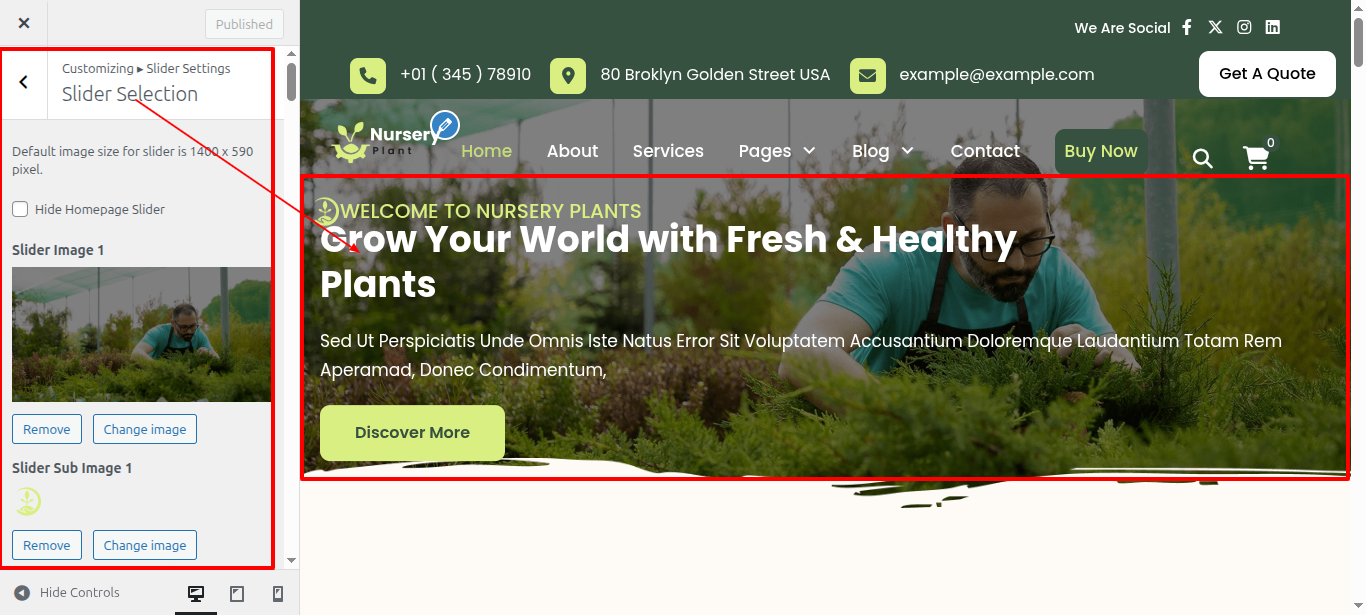 - Access the WordPress admin panel and go to Appearance > Customize > Slider Section > Slide Image Selection.