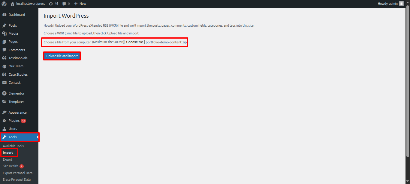 - Click the "Browse" button, select the portfolio-demo-content.xml documents and after which select "Importing along with upload the file."