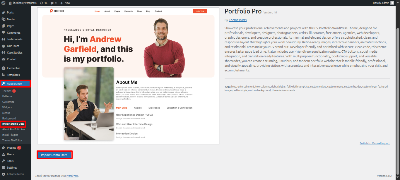 - Go to Appearance and then select Import Demo Data .