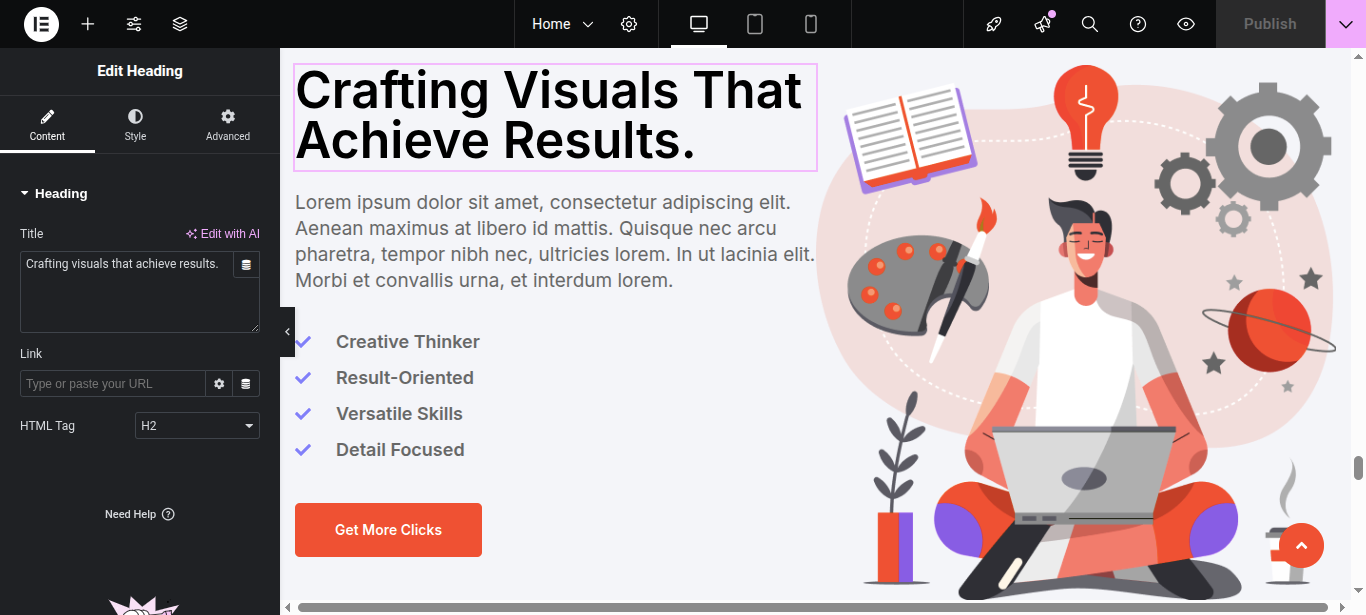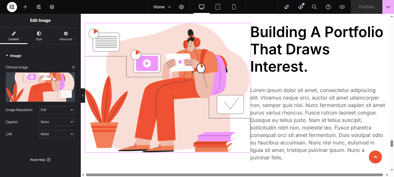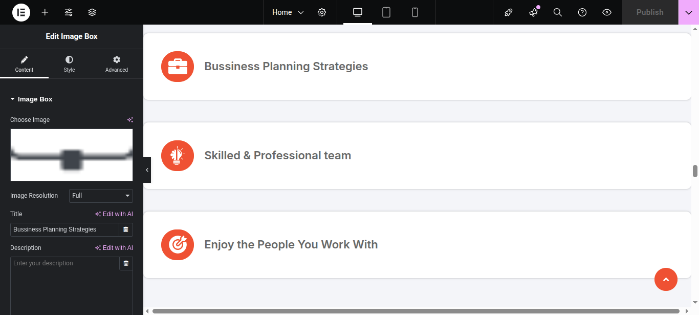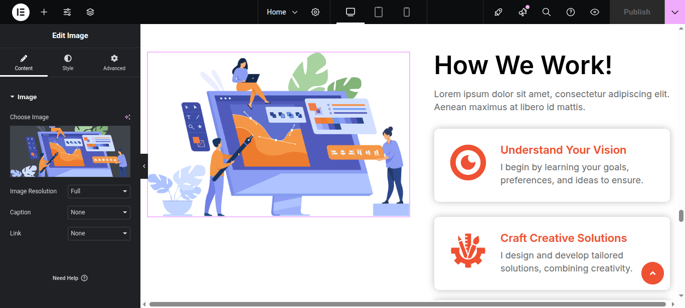 In Elementor, you can edit your page using various widgets. Simply click on the section user wish to modify, and an editor panel will appear on On the left hand side. Use this panel to customize the section as needed.
