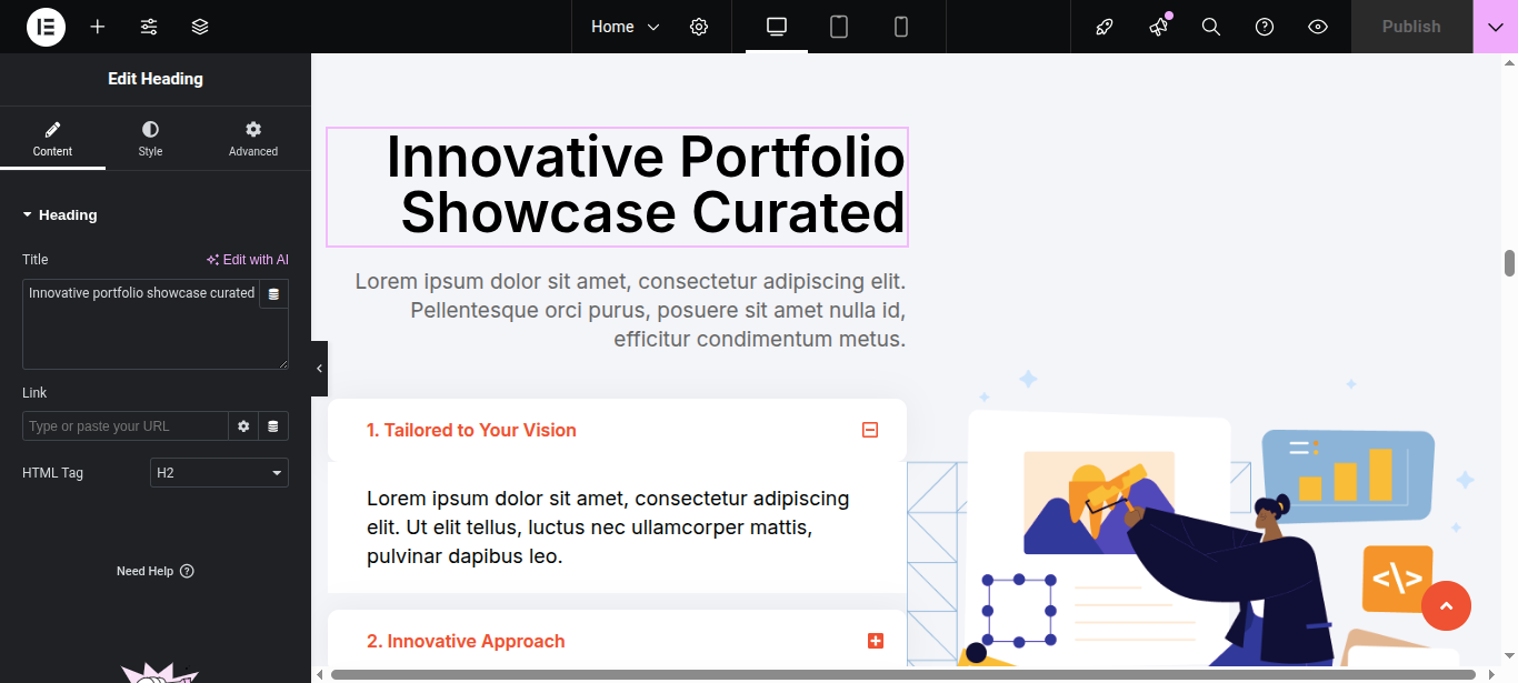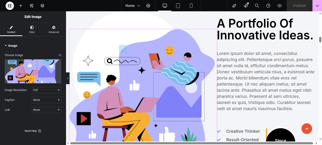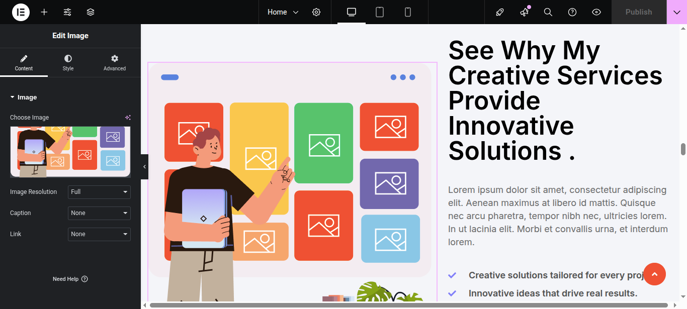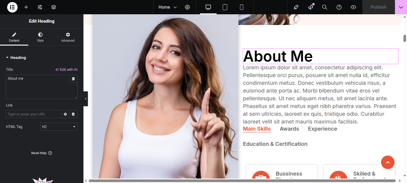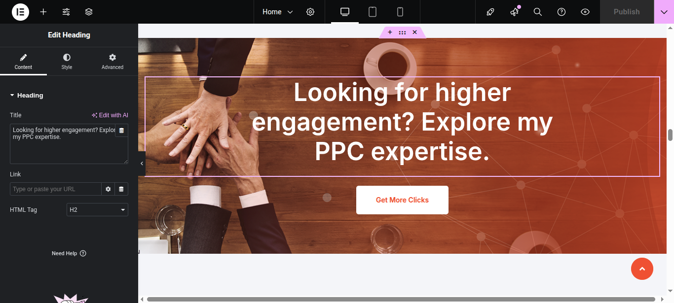 In Elementor, you can edit your page using various widgets. Simply click on the section user wish to modify, and an editor panel will appear on On the left hand side. Use this panel to customize the section as needed.